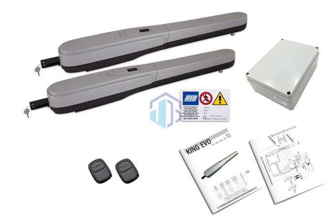 Irreverzibilis motor szett akár 4 m hosszú és 400 kg súlyú szárnyas kapukhoz: motorkar-pár, vezérlés, távirányítók, fotocella.